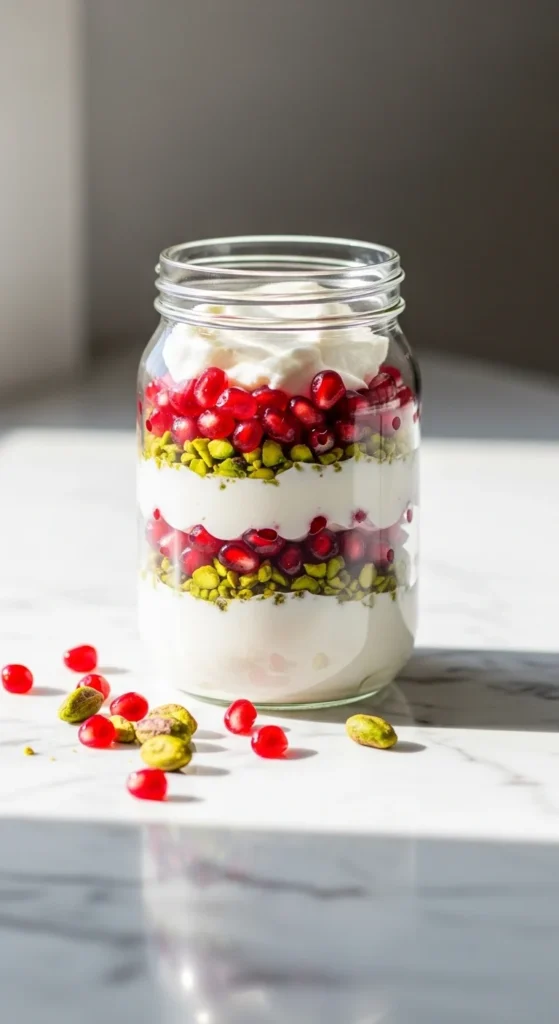 Layer thick Greek yogurt with fresh pomegranate seeds. Add a sprinkle of chopped pistachios between layers. Continue layering for visual contrast.