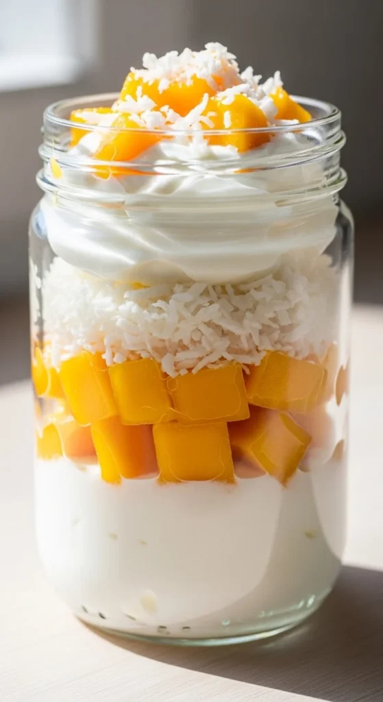 Mango adds juicy sweetness, while coconut brings subtle richness. This parfait feels light and refreshing, which works well for warm mornings.